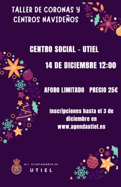 El domingo 14 de diciembre de 2025 a las 12:00 h, Utiel acoge, en el centro social, un taller creativo para aprender a elaborar centros y coronas navideñas con materiales naturales y técnicas guiadas paso a paso.